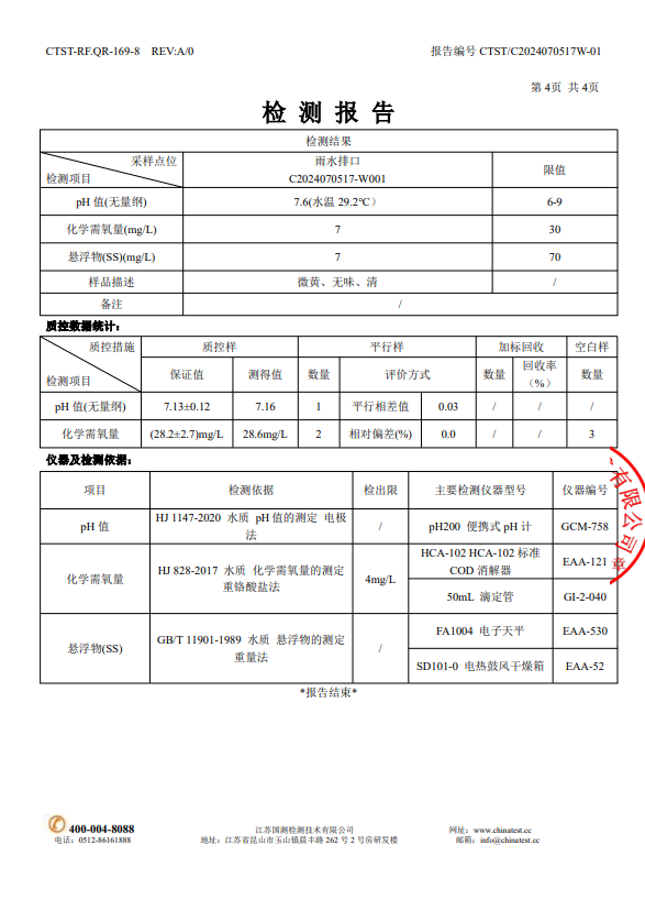2024年07月06日,伟德国际victor1946委托第三方检测公司江苏国测检测技术有限公司于伟德国际victor1946厂区北侧雨水排放口取雨水水样进行检测,监测指标为COD(化学需氧量)、悬浮物和PH值,检测结果:COD:7mg/l,悬浮物:7mg/l ,PH:7.6,水质结果判定符合《地表水环境质量标准》标准中表1中IV类标准,COD:30 mg/l,PH值范围:6-9,悬浮物:70 mg/l。