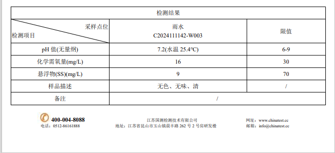 2024年11月12日,伟德国际victor1946委托第三方检测公司江苏国测检测技术有限公司于伟德国际victor1946厂区北侧雨水排放口取雨水水样进行检测,监测指标为COD(化学需氧量)、悬浮物和PH值,检测结果:COD:16mg/l,悬浮物:9mg/l ,PH:7.2,水质结果判定符合《地表水环境质量标准》标准中表1中IV类标准,COD:30 mg/l,PH值范围:6-9,悬浮物:70 mg/l。