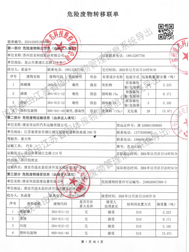 2024年12月25日,伟德国际victor1946委托危险废弃物运输单位淮安交运危货运输有限公司、处置单位张家港市华瑞危险废物处理中心有限公司转移及处置危险废弃物,所转移及处置的危险废弃物分别为:滤渣(264-011-12)0.171吨、浓缩液(264-011-12)2.223吨、污泥(264-012-12)5.105吨、颜料包装物(900-041-49)15.971吨,所处置及转移的危险废弃物经过《江苏省生态环境厅江苏省污染源“一企一档”管理系统》申报审批通过,转移及处置量在危险废弃物管理计划内。