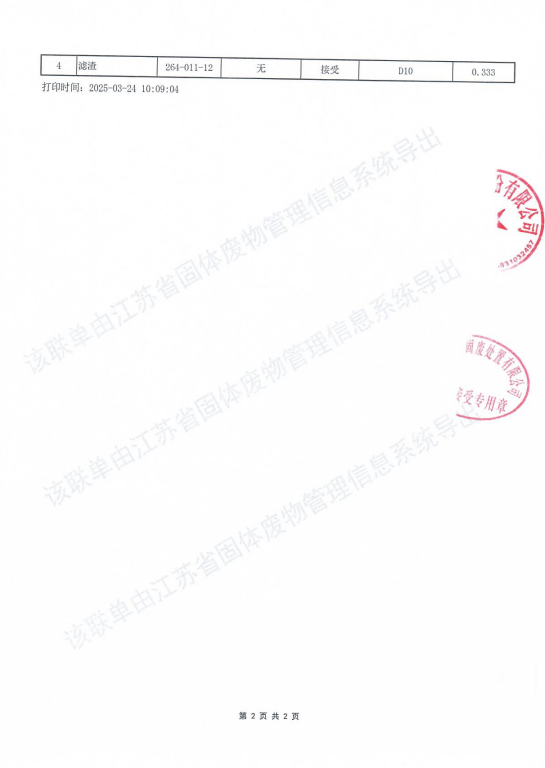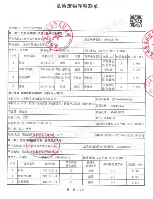 2025年3月21日,伟德国际victor1946委托危险废弃物运输单位江苏快而捷物流股份有限公司、处置单位江苏永之清固废处置有限公司转移及处置危险废弃物,所转移及处置的危险废弃物分别为:滤渣(264-011-12)0.333吨、污泥(264-012-12)3.302吨、颜料包装物(900-041-49)9.857吨、实验废物(900-047-49)0.231,所处置及转移的危险废弃物经过《江苏省生态环境厅江苏省污染源“一企一档”管理系统》申报审批通过,转移及处置量在危险废弃物管理计划内。