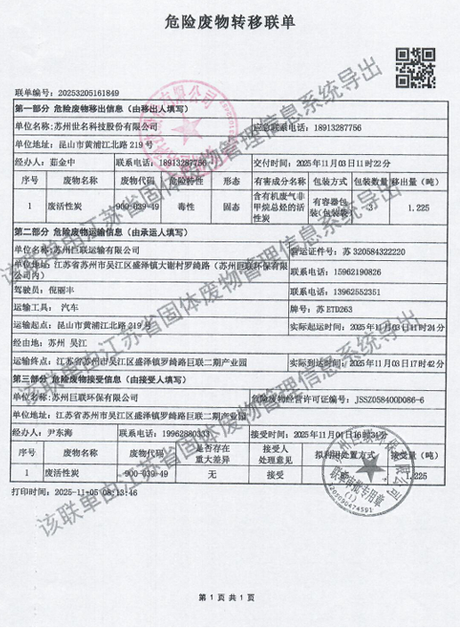 2025年11月3日,伟德国际victor1946委托危险废弃物运输单位苏州巨联运输有限公司、处置单位苏州巨联环保有限公司转移及处置危险废弃物,所转移及处置的危险废弃物分别为:废活性炭(900-039-49)1.225吨,所处置及转移的危险废弃物经过《江苏省生态环境厅江苏省污染源“一企一档”管理系统》申报审批通过,转移及处置量在危险废弃物管理计划内。