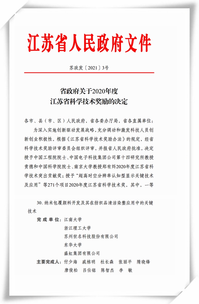 日前,江苏省人民政府发布了《关于2020年度江苏省科学技术奖励的决定》,伟德国际victor1946科技参与完成的项目 “纳米包覆颜料开发及其在纺织品清洁染整应用中的关键技术”荣获省科学技术二等奖。
